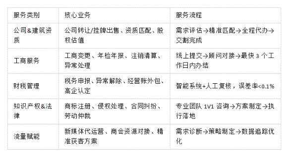 赢猎企业服务平台以“全场景、全周期、全链路”为核心理念,深度整合公司转让信息服务,工商服务、财税管理、法律支持、建筑资质信息、流量赋能六大核心模块,打造企业从初创到成熟、从危机到机遇的一站式解决方案。无论您是寻找优质在售公司、处理紧急工商异常,还是规划知识产权布局,赢猎平台都能精准匹配需求,让企业运营无忧。